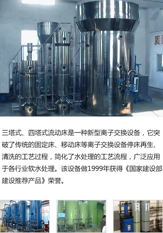 三塔式、四塔式流動床是一種新型離子交換設備,它突破了傳統的固定床、移動床等離子交換設備停床再生、清洗的工藝過程,簡化了水處理的工藝流程,廣泛應用于各行業軟水處理。該設備做1999年獲得《國家建設部建設推薦產品》榮譽。